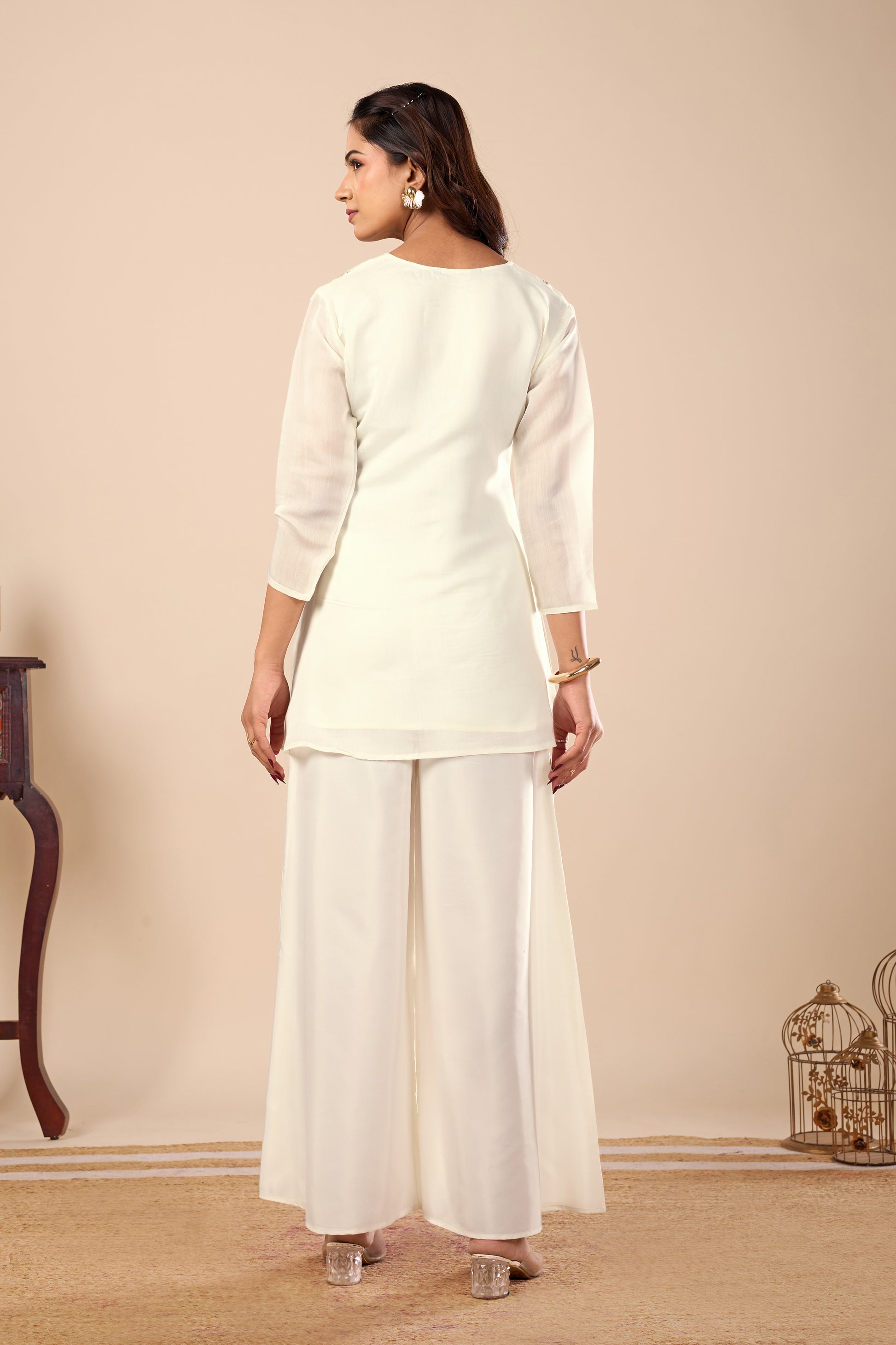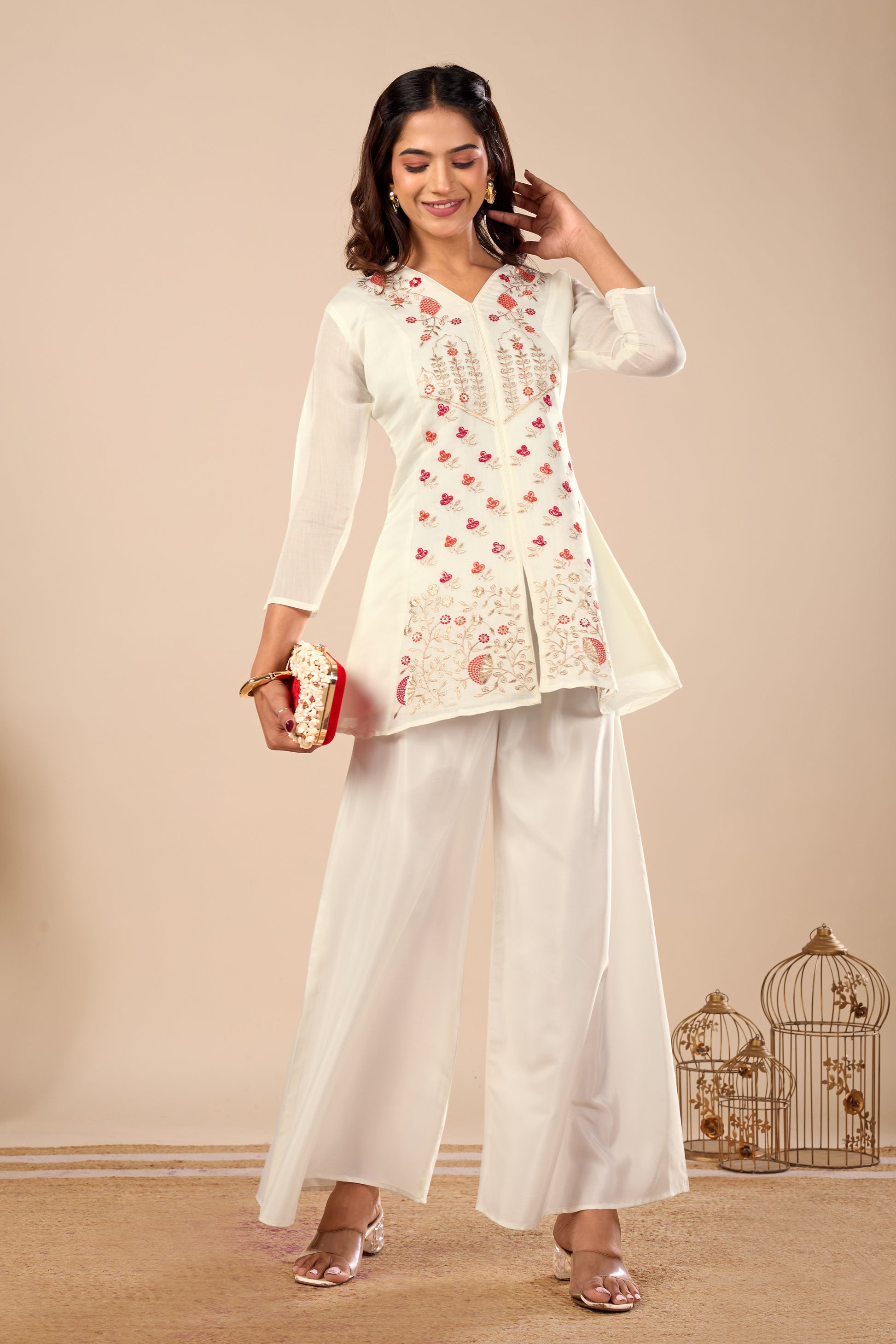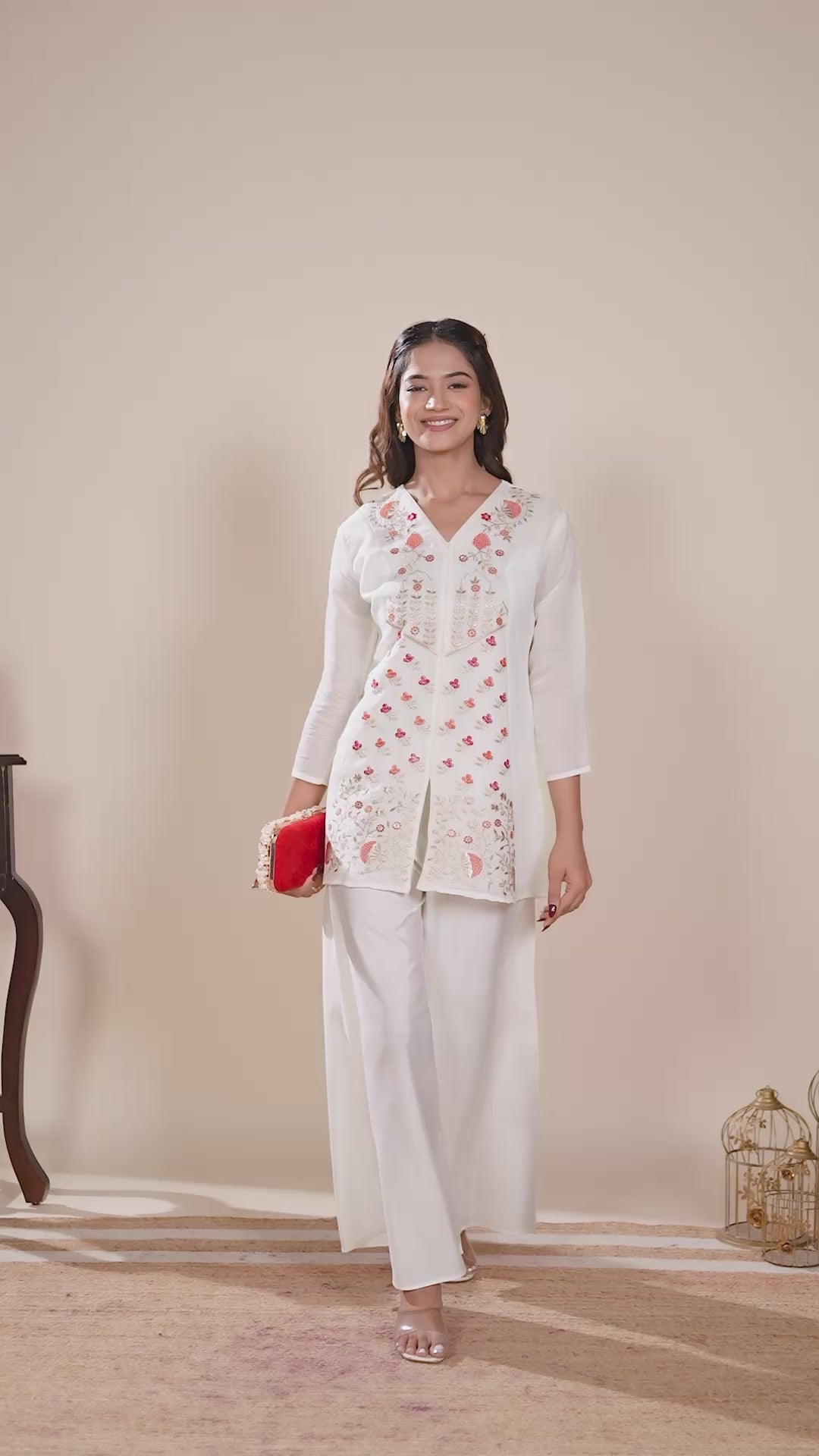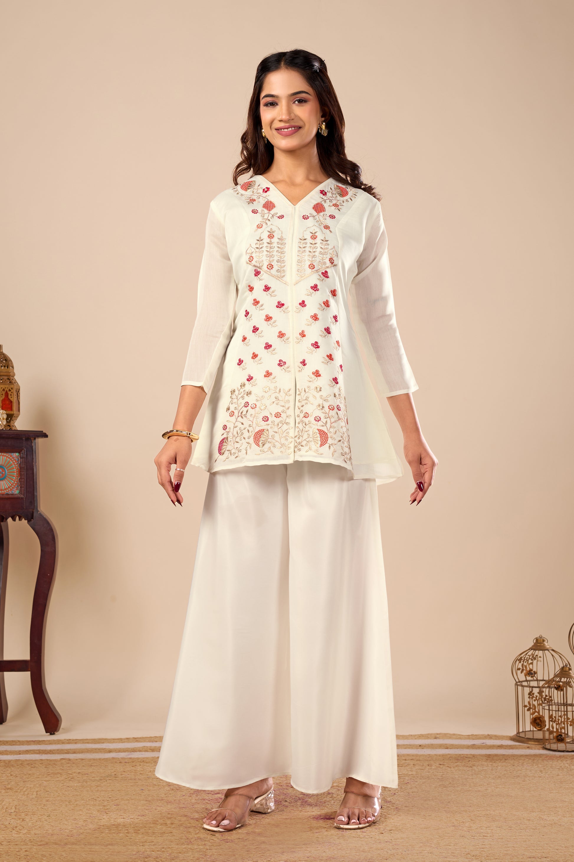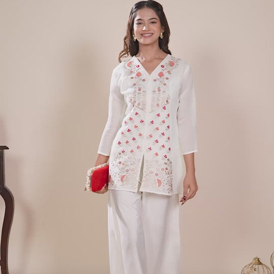 Elevate your everyday ethnic style with the Kusum White Floral Embroidered Co-ord Set, crafted in breathable and lightweight Mul Chanderi fabric. The elegant straight tunic is adorned with delicate floral embroidery, paired effortlessly with flowy slip-on plazo pants for a refined yet comfortable silhouette. Ideal for casual outings, festive mornings, or relaxed gatherings, this co-ord set blends timeless charm with modern ease.