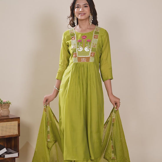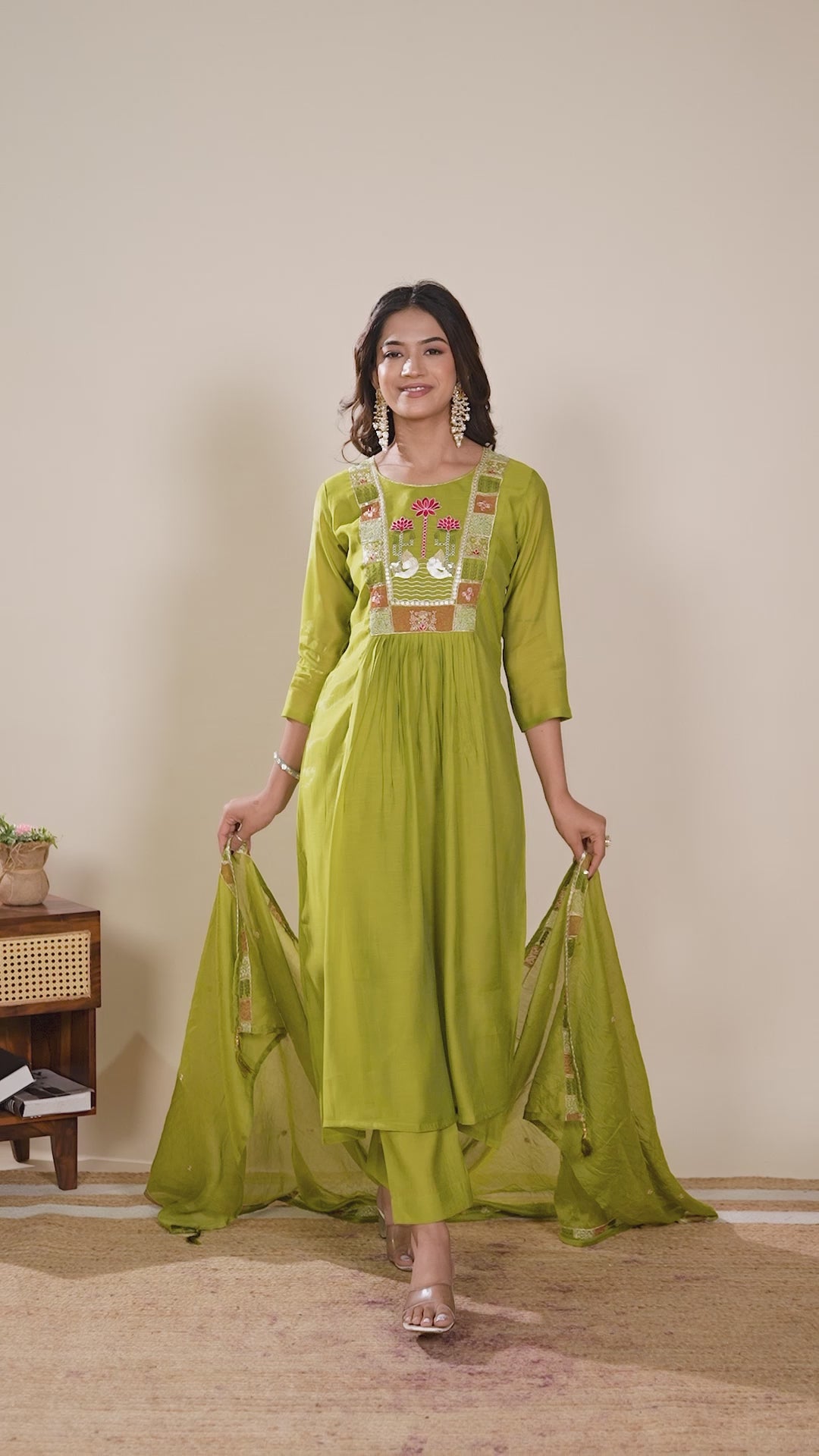 Lotus Green Embroidered Pure Mul Chanderi Anarkali Kurta With Dupatta Set