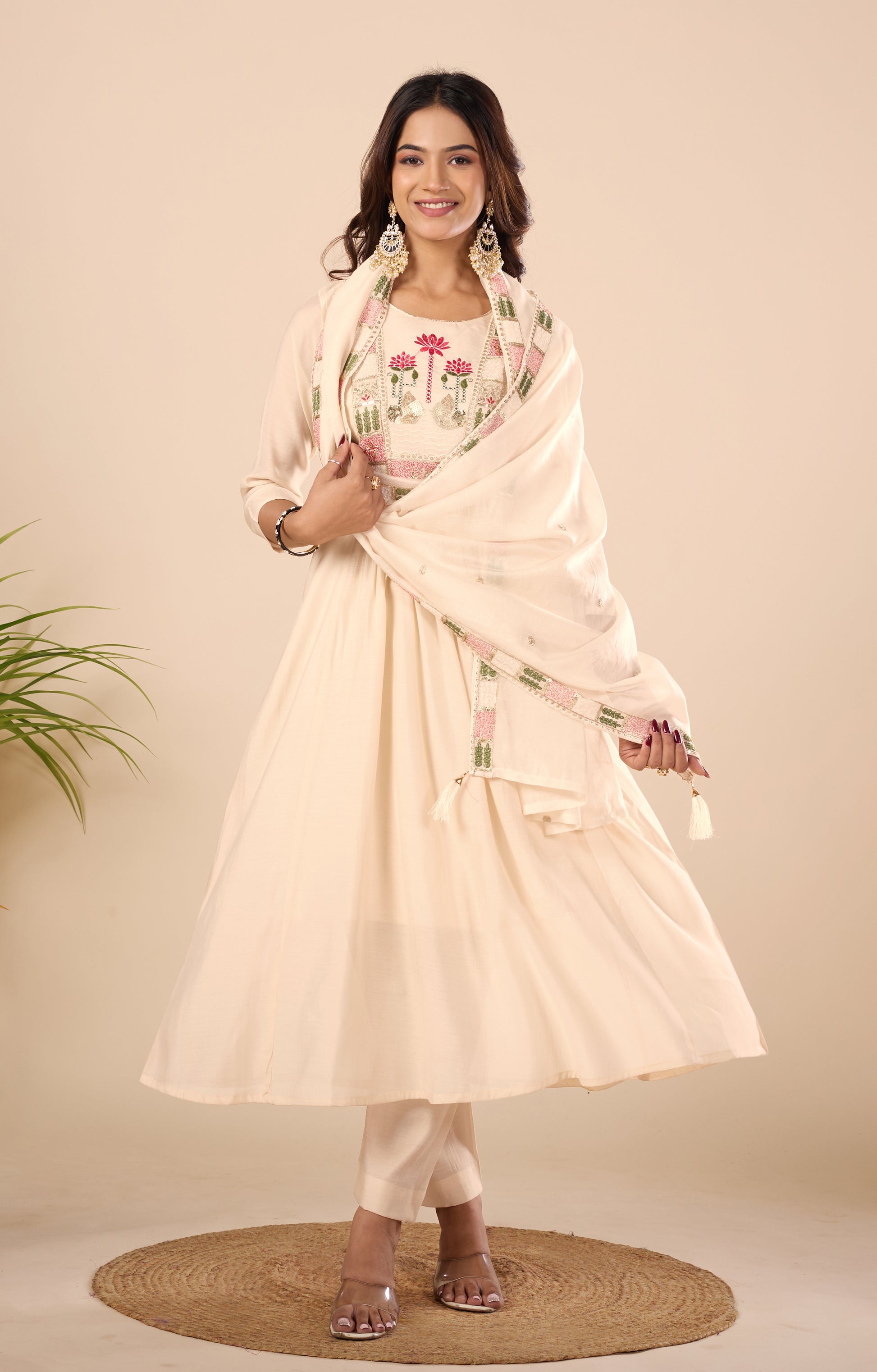 Lotus Peach Embroidered Pure Mul Chanderi Anarkali Kurta With Dupatta Set