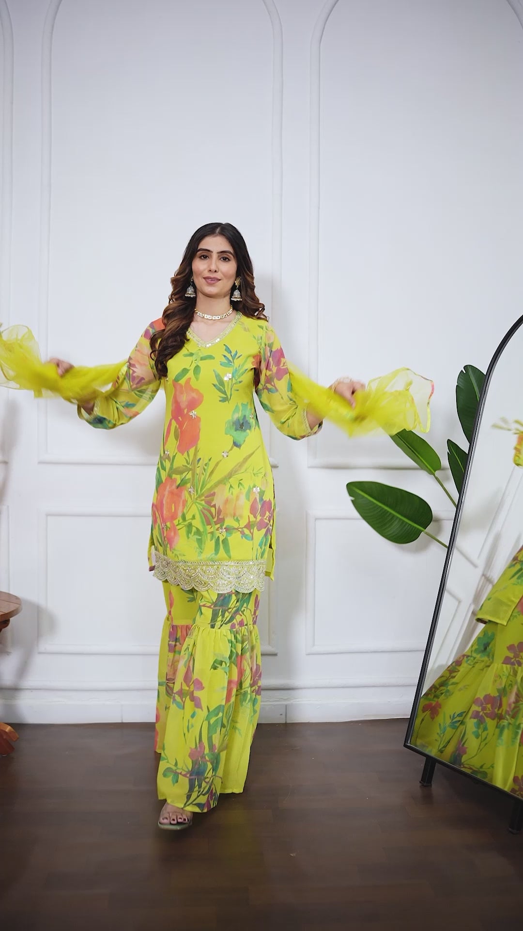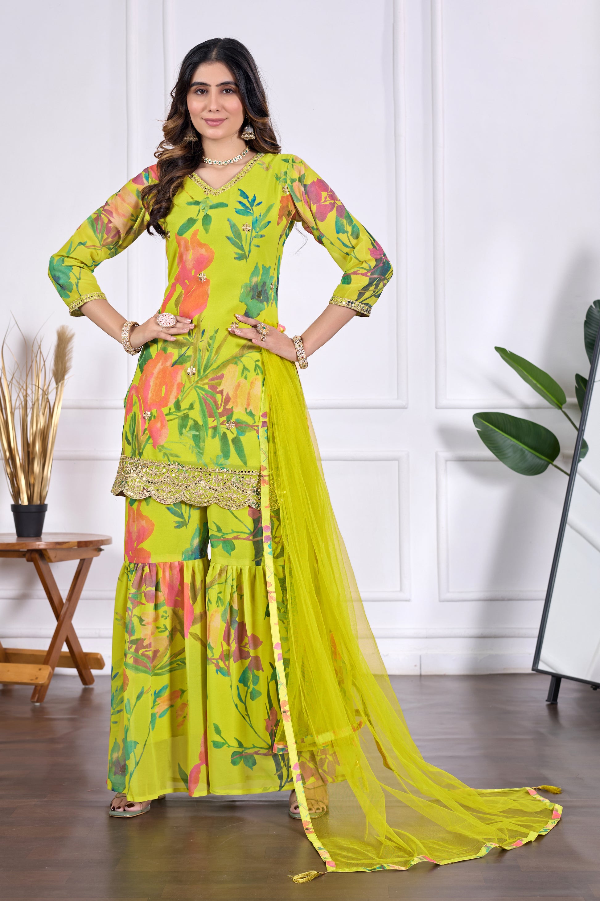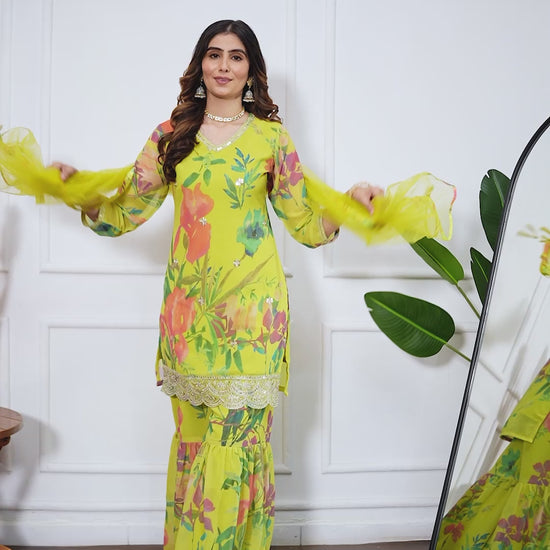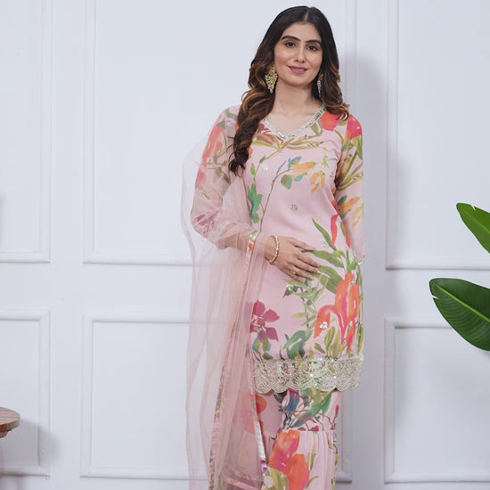 Make a graceful festive statement with the Palak Embroidered Printed Sharara Set with Dupatta. Designed with vibrant floral prints, delicate embroidery, and a soft flared silhouette, this three-piece ensemble includes a charming kurta, airy sharara pants, and a lightweight dupatta — perfect for festive celebrations, haldi, mehendi, wedding events, or elegant day functions.